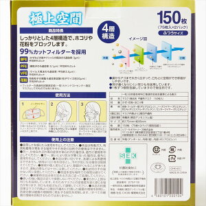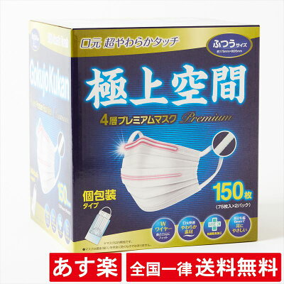 マスク 不織布 極上空間 4層プレミアム【150枚】 ふつうサイズ 個包装 不織布 風邪 予防 花粉 ほこり ウィルス 対策 ダブルワイヤー 抗菌防臭加工【あす楽】【送料無料】